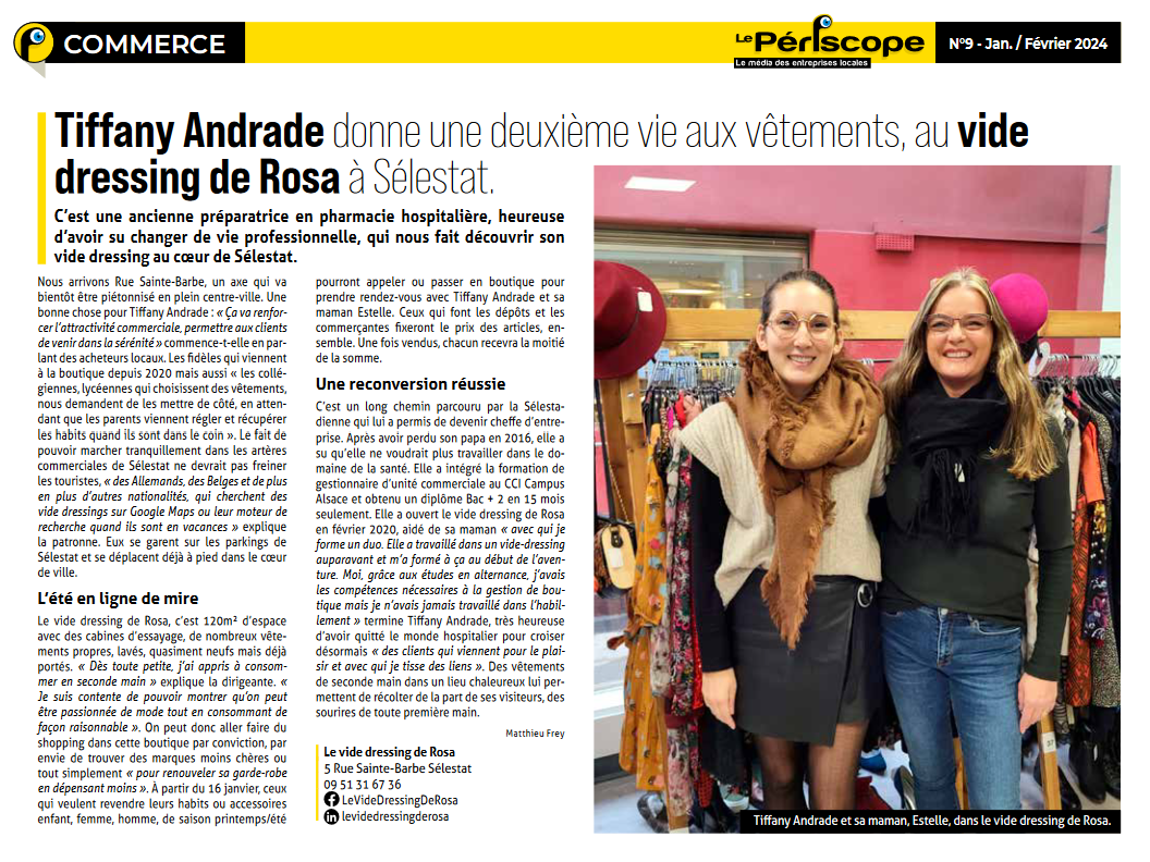 Plongez au cœur de notre histoire familiale, orchestrée par les deux femmes fortes derrière le comptoir : Estelle et Tiffany. Forte de 12 années d’expérience dans la vente de vêtements en dépôt-vente, Estelle a transmis sa passion à sa fille Tiffany, également passionnée de mode. Ensemble, elles ont réalisé le rêve de créer un dépôt-vente de vêtements en plein centre de Sélestat. Notre magasin, porté par le lien familial qui unit Estelle et Tiffany, est ouvert à tous, offrant des vêtements de marques variées à des prix abordables. Au-delà du commerce, notre mission est de donner une seconde vie aux vêtements, insufflant une touche personnelle et écoresponsable à chaque pièce. Découvrez notre sélection unique, façonnée par l’expérience d’Estelle et la passion de Tiffany, et rejoignez notre famille pour redonner vie à la mode d’une manière qui compte.